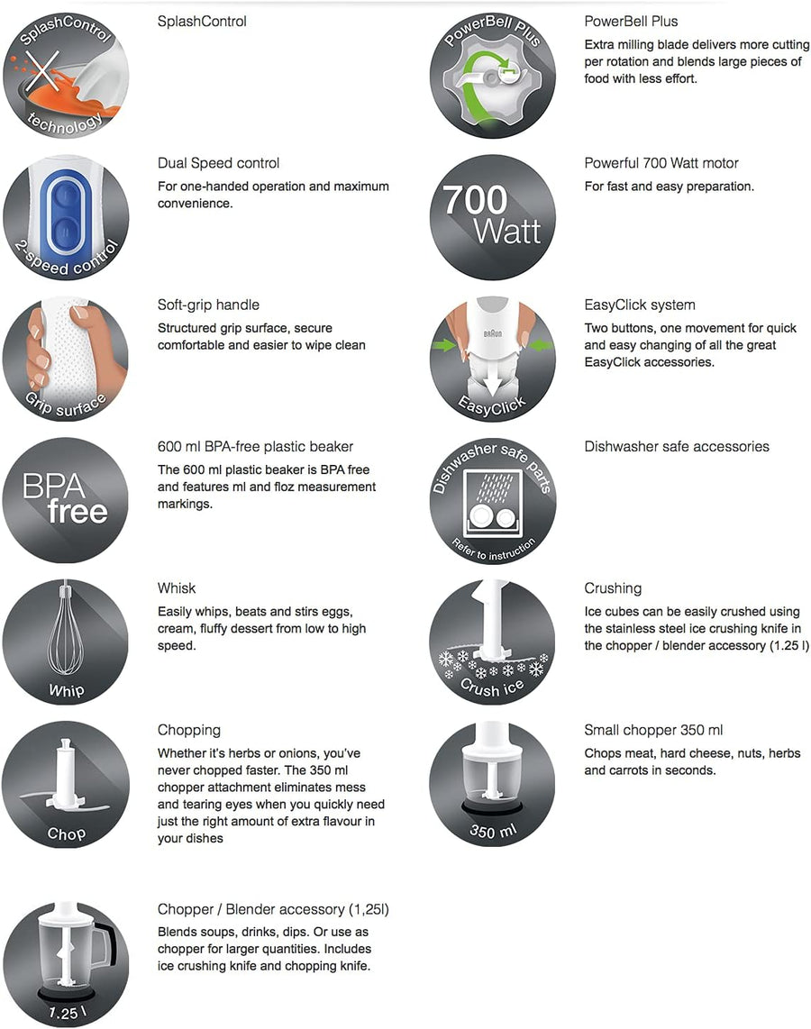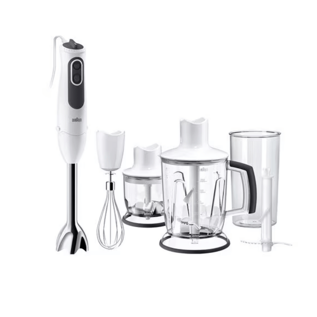 The Braun MultiQuick 3 Vario MQ3145 Aperitive is a versatile 750W hand blender featuring an 11-speed Vario control wheel for fine-tuned blending. Its SplashControl technology keeps your kitchen mess-free, while the PowerBell Plus blending shaft with an additional cutting blade delivers faster, smoother results. Designed with the EasyClick system, changing between attachments is fast and effortless.