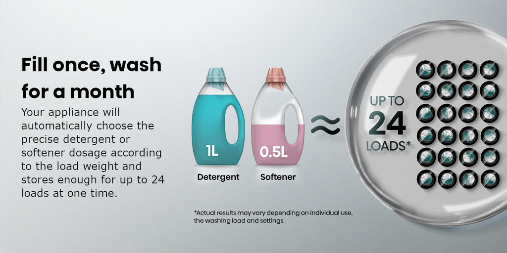 Stores detergent for up to 24 washes.