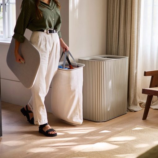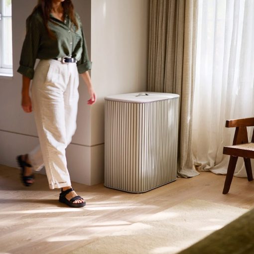 It features two 45L removable fabric bags, ventilated panels for airflow, and a sleek ecru finish that fits modern homes.