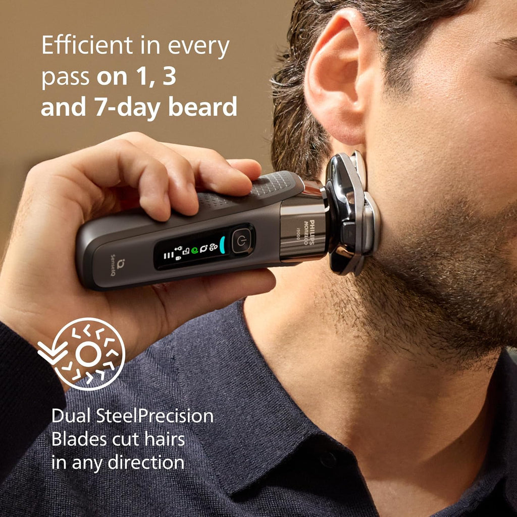 Experience the pinnacle of rotary shaving with the Philips Norelco Shaver i9000 (X9002/82). This advanced SenseIQ-powered shaver is designed to deliver a flawless 0.00mm finish while prioritizing skin health. Its patented Triple Action Lift & Cut system gently lifts each hair before cutting it at the root, ensuring long-lasting smoothness. The 360-degree Rotating Dual SteelPrecision Blades perform up to 150,000 cutting actions per minute, making it incredibly efficient even on thick, 7-day hair growth.