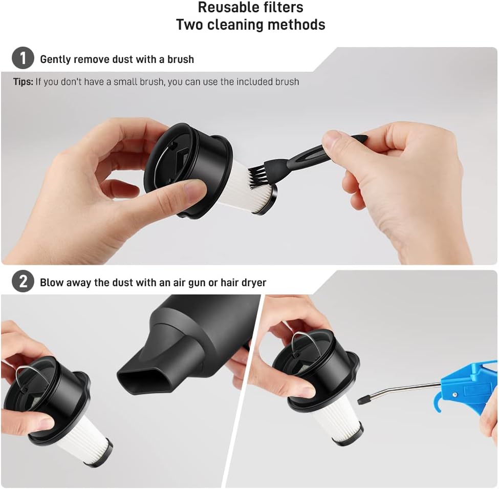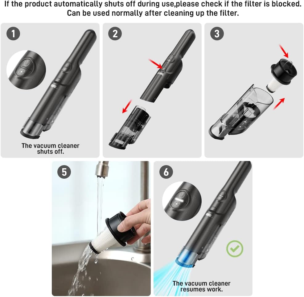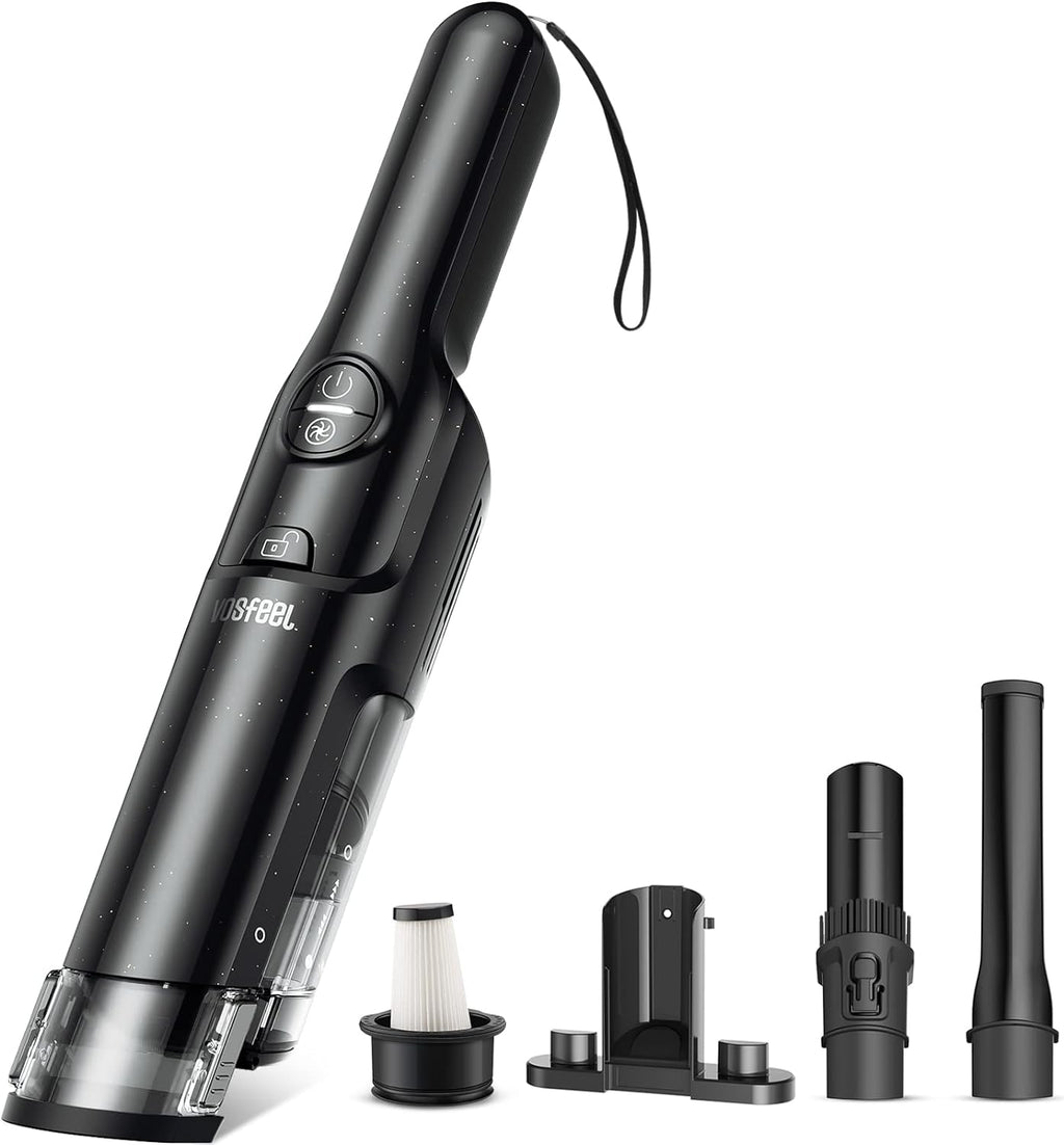 The Vosfeel Cordless Handheld Vacuum is a powerful cleaning tool that makes picking up dirt and crumbs easy. Its sleek black design looks great and fits anywhere in your home. You can use it to clean your car, furniture, or floors. It's lightweight and cordless, so you can take it anywhere without being bothered by cords.